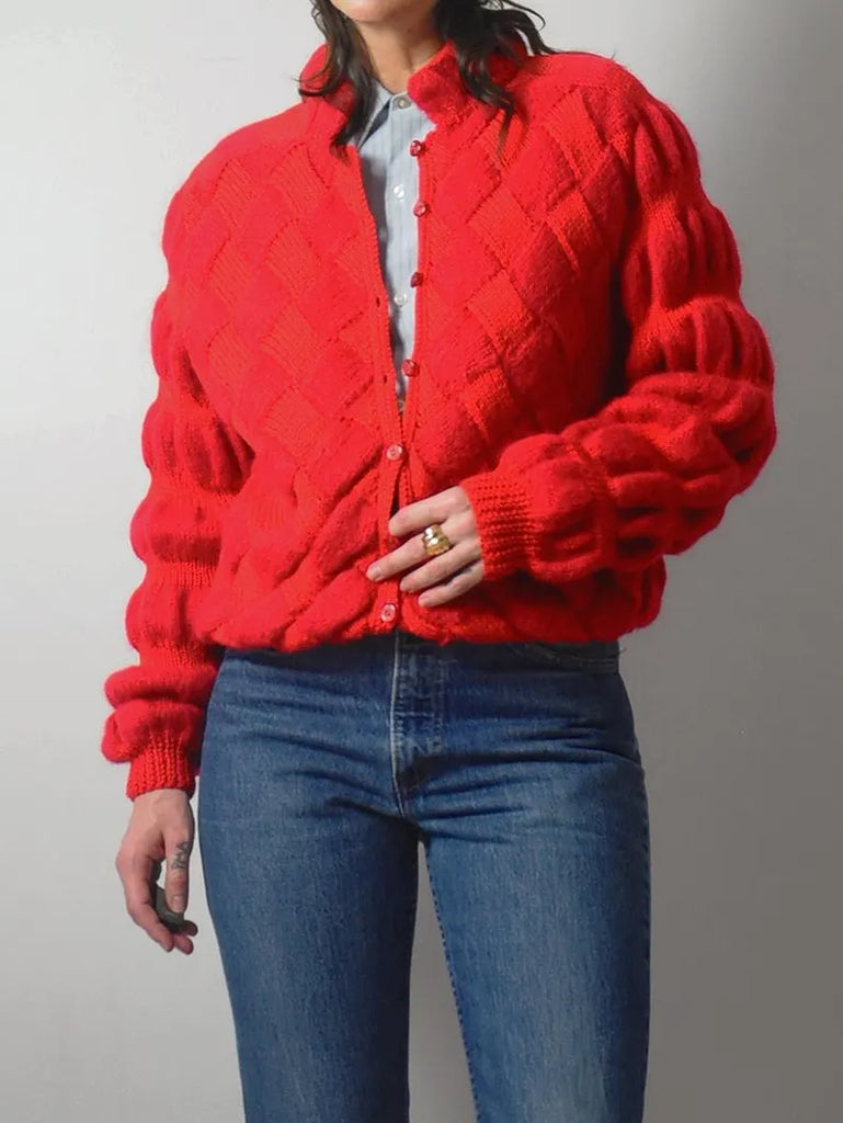 -Basketweave knit with bubble sleeves.