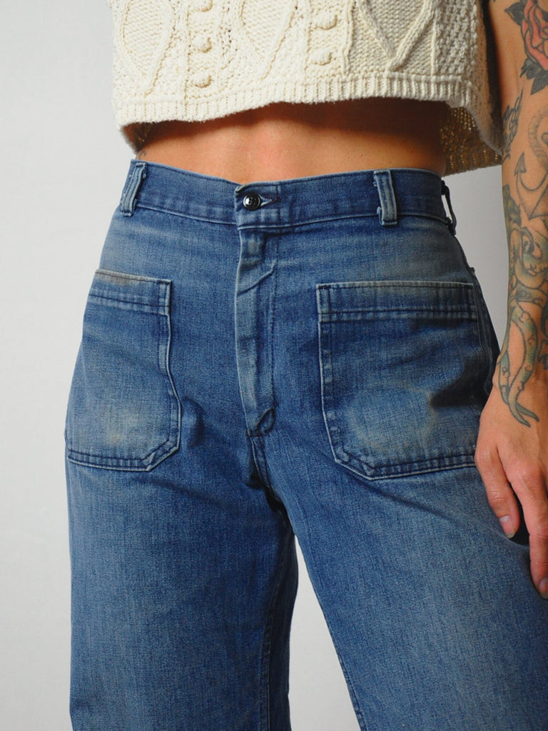 Vintage 1987 faded & flared Navy issue Jeans. Pockets and button closure. Faded "Martin" by back pocket. Front and back patch pockets. Flared legs. Flared, soft denim. **pinned at waist on model.