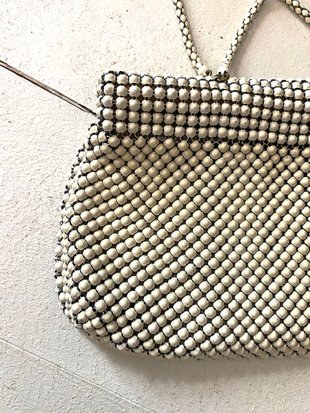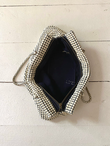 1930's Whiting & Davis ivory metal mesh "Alumesh" bag. Rarer find with zipper closure. Chain carrying strap. Lined with pocket.
