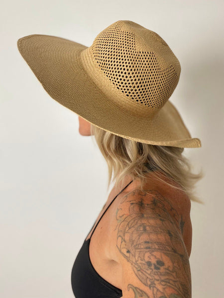 Vintage 40's woven straw sun hat. Beautiful floral woven pattern. Wide brim. Former owner's name inside.