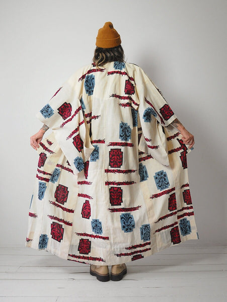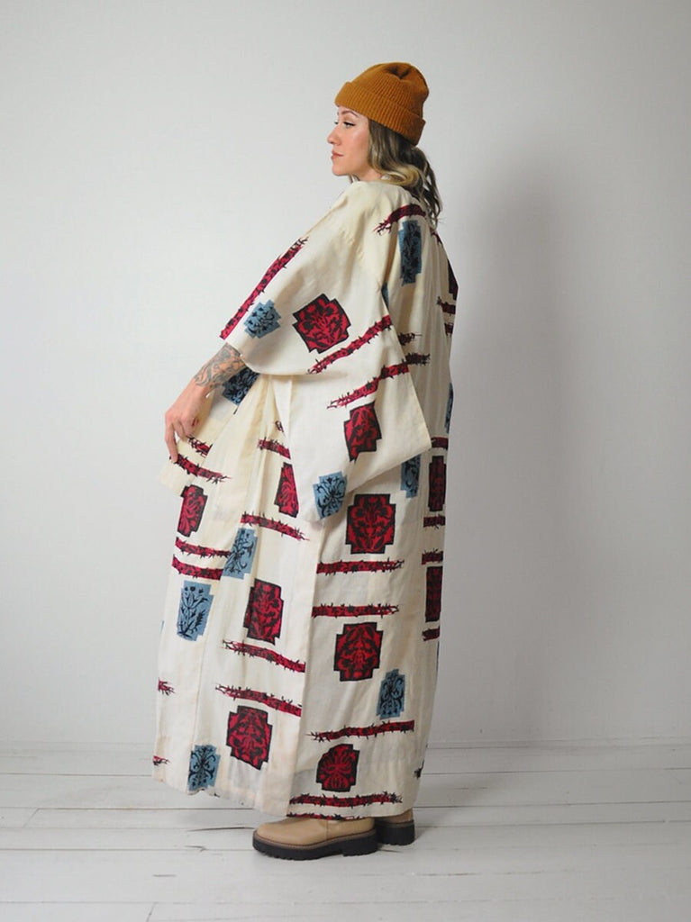 Vintage 1950's cotton kimono robe. Long, maxi shape with draped sleeves. Abstract botanical floral print.