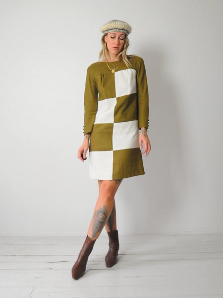 Vintage 1960's olive & ivory checkered shift dress. Woven material. Zipper and buttons at back of neck. Slightly flared sleeves. Fully lined. Pleated chest detail.