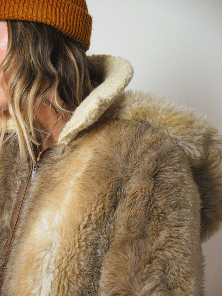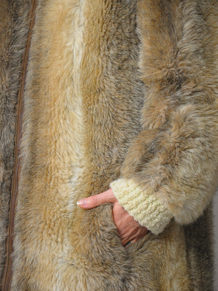 Vintage 1970's faux fur coat. Warm fuzzy knit. Double zipper down the front. Large, cozy removable hood. Pockets and fully lined.