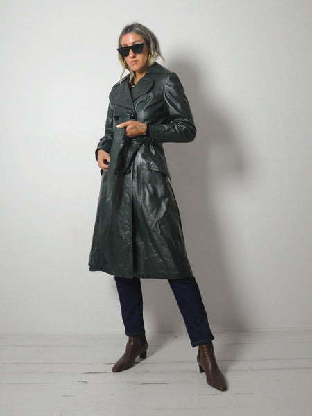1970's hunter green leather trench coat. Double buttons down the front. Elastic at back of waist with built in belt. Pockets and full lining. Button details at back of shoulders.
