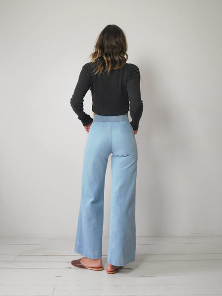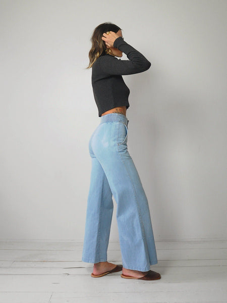 vintage 1970's light wash bell bottom jeans. High waist with zipper and button closure. Elastic at back of waist. Wide, flared bellbottom leg shape.