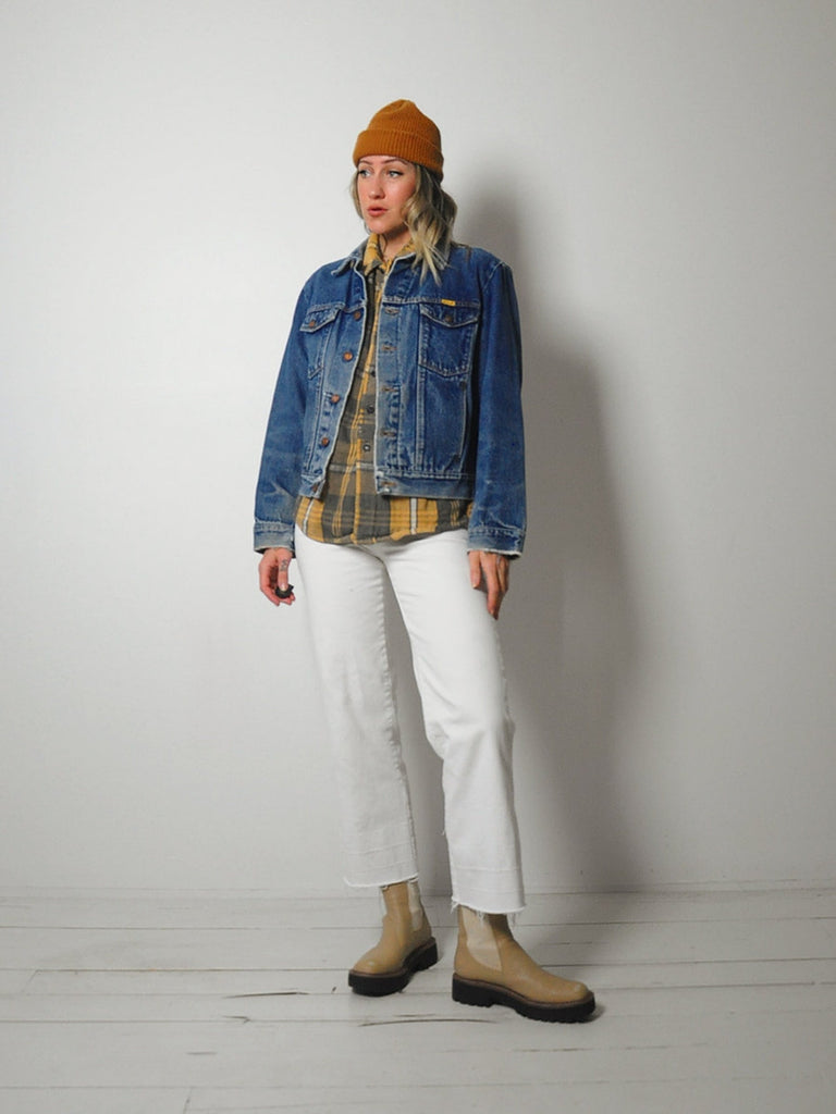 Vintage 70's/80's faded Rustler jean jacket. Best faded patina with fraying throughout. Buttons down the front. Pockets.