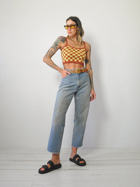 Vintage 80's Levi's 550 Jeans. Classic lighter wash denim. High waist shape. Relaxed, straight leg fit. *pinned on model with belt.